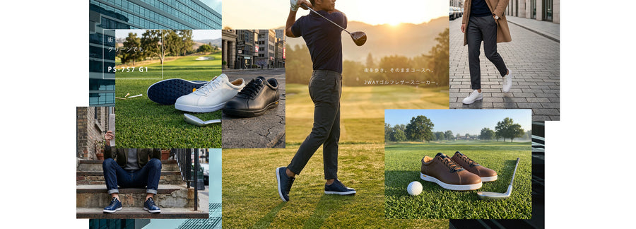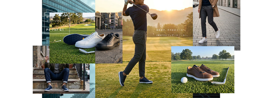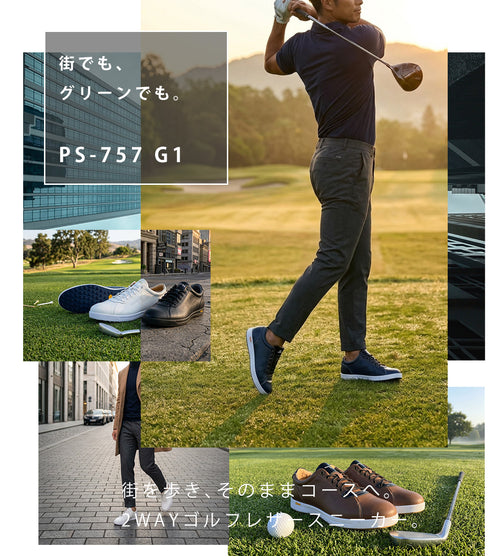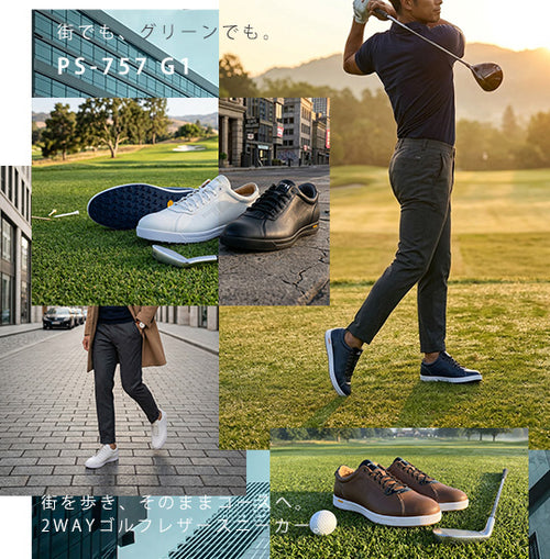 街履きもできる、2WAYゴルフレザースニーカー。 【PS-757G1】 プレーンでスッキリとした印象に仕上げた、ゴルフ&タウン兼用のレザースニーカー。 サイドにはきめ細かいパンチングを施し、さりげなくブランドアイデンティティーを表現。さらに、アイレットステイと踵部分にはエナメル素材を使用し、異素材の組み合わせが足元に上品なアクセントを加えます。 スパイクレス仕様により、ゴルフプレーはもちろん、ラウンド後もそのまま街へ出かけられるデザイン。 機能性とファッション性を兼ね備えた、新しいゴルフスタイルのための一足です。 採用したVIBRAM社のスパイクレスソールにより、タウンユースからゴルフスタイルまで機能性も兼ね備えた万能使いのできるスパイクレスゴルフスニーカー。 詳細 アッパーUPPER フルグレインレザーFull-Grain Leather ライニングLINING ピグスキンPig-skin インソールIN-SOLE Open-Sell PU form/ピグスキンウレタンフォームの種類 軽く通気性もよく耐久性に優れた素材 アウトソールOUT-SOLE ラバーRubber *VIBRAM 社