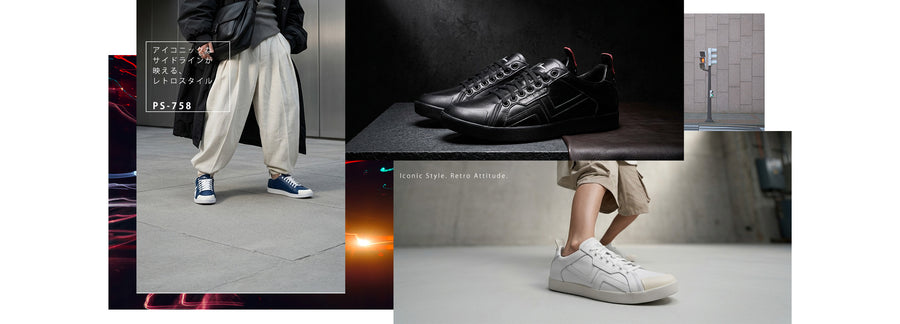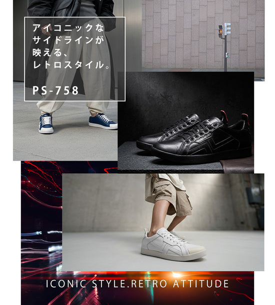 アイコニックなサイドラインが映える、レトロスタイル。 【PS-758】 クラシックなデザインを現代的にアップデートした、レトロライクなレザースニーカー【PS-758】。 上質なレザーを使用したシンプルなフォルムに、アイコニックなサイドラインが映えるデザイン。どこか懐かしさを感じさせながらも、現代のスタイルに自然と馴染む一足に仕上げました。 カジュアルからキレイめまで幅広いスタイルに合わせやすく、足元にさりげない個性を演出します。クラシックと現代が融合した、大人のためのレザースニーカーです。 詳細 アッパーUPPER フルグレインレザー+ヌメレザーFull-Grain Leather +Vegetable tannde Leather ライニングLINING キャンバスCVS インソールIN-SOLE Open-Sell PU form/キャンバスウレタンフォームの種類 軽く通気性もよく耐久性に優れた素材 アウトソールOUT-SOLE ラバーRubber *VIBRAM 社