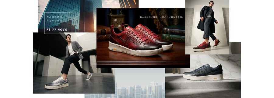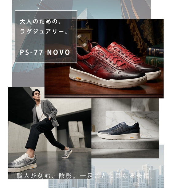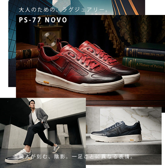 大人のための、ラグジュアリースニーカー。 【PS-77 NOVO】 PS-77 NOVOは、クラシックなコート系シルエットをベースに、きめ細かい上質なカウレザーを使用。その革に、色の濃淡や陰影を生み出す独特な加工を施し、一足ごとに異なる表情を持つラグジュアリーなスニーカーに仕上げました。 クラシカルなデザインでありながら、足元にさりげない個性と色気を演出。 革靴のような存在感と、スニーカーの履きやすさを兼ね備えた、大人のための一足です。 ・色合いの変化:職人により一足一足特殊な加工によって、革の表面に独特の色合いや色の変化が生み出されています。 ・陰影を持つ加工:革の表面には、陰影や立体感を演出するための加工が施されています。これにより、革の質感がより豊かに表現され、独特の雰囲気を持つスニーカーに仕上がっています。 ・快適な履き心地:高品質なカウレザーは、履き込むほどに馴染み、快適な履き心地を提供します。また、しっかりとした作りで足をしっかりサポートやライニング、インソールにもカウレザーを使用し足蒸れを軽減するなど、長時間の歩行でも疲れ難く快適に履けるスニーカーです。 詳細 アッパーUPPER フルグレインレザーFull-Grain Leather ライニングLINING カウレザーCow Leather インソールIN-SOLE Open-Sell PU form/カウレザー ウレタンフォームの種類 軽く通気性もよく耐久性に優れた素材 アウトソールOUT-SOLE ラバーRubber *VIBRAM 社